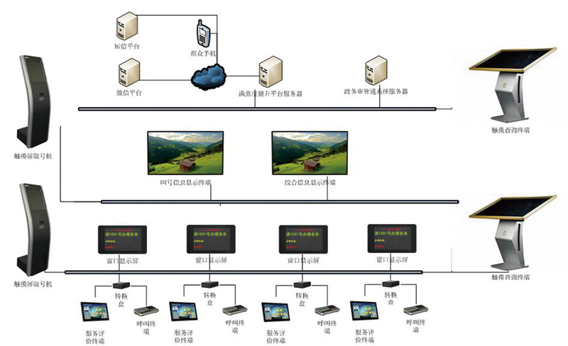 慧能科技依據(jù)自身豐富的政務(wù)服務(wù)行業(yè)經(jīng)驗(yàn)和研發(fā)創(chuàng)新能力,貼合群眾需求,整合資源研發(fā)了“智慧政務(wù)平臺(tái)”。該平臺(tái)集成了排隊(duì)叫號(hào)、服務(wù)評(píng)價(jià)、信息交互與發(fā)布、移動(dòng)互聯(lián)網(wǎng)應(yīng)用、大數(shù)據(jù)可視化展示、大數(shù)據(jù)分析與決策輔助等功能模塊。平臺(tái)軟件采用B/S 架構(gòu)設(shè)計(jì),方便安裝、使用與維護(hù)。通過與互聯(lián)網(wǎng)、移動(dòng)互聯(lián)網(wǎng)技術(shù)的結(jié)合、與“政務(wù)業(yè)務(wù)系統(tǒng)”、“電子政務(wù)平臺(tái)系統(tǒng)”、“OA系統(tǒng)”等業(yè)務(wù)系統(tǒng)的數(shù)據(jù)對(duì)接,可以為辦事的人民群眾提供準(zhǔn)確、及時(shí)、有效的信息,改善辦事秩序,方便人民群眾辦事,提高人民群眾對(duì)政府辦事機(jī)構(gòu)的滿意度。